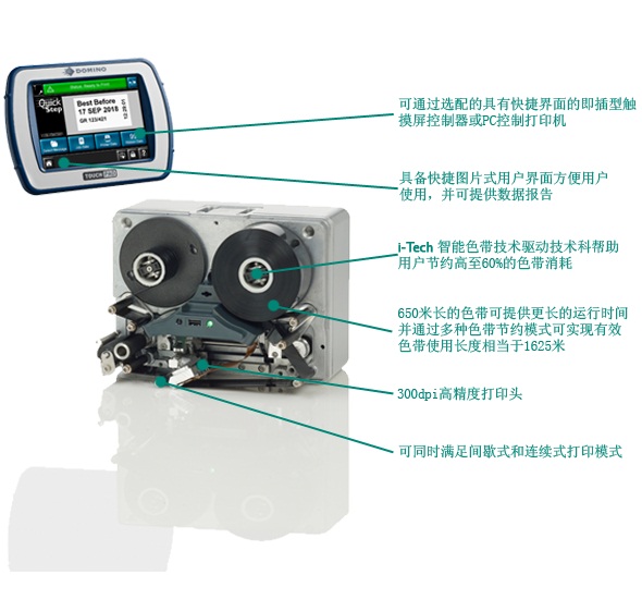 多米诺独特的“Dancing Arm”色带张力缓冲技术可防止色带断裂的发生,减少停机时间