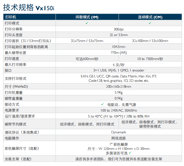 ① Vx150i可在300dpi清晰打印分辨率下提供高达每秒6次的打印频率,以及最大53mm的打印宽度。